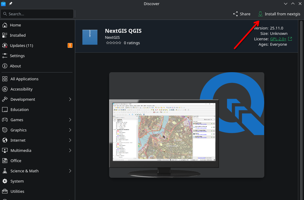 Откройте com.nextgis.ngqgis.flatpakref в графическом установщике, например, KDE Discover (в окружении KDE) или Gnome Software (в окружении Gnome)
