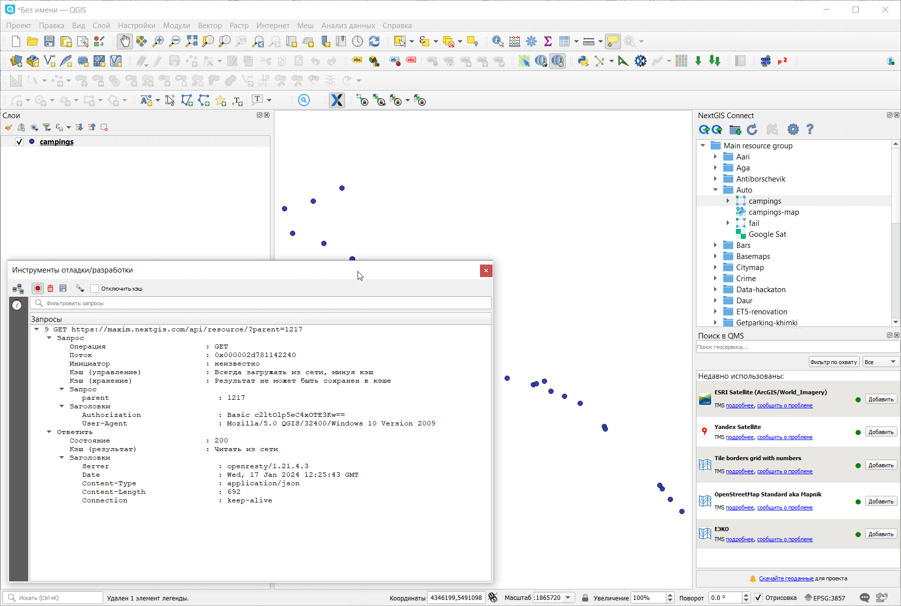 Данная функциональность используется для отладки и выяснения причин ошибок доступа к веб-сервисам. Рассматривается на примере работы с модулем NextGIS Connect, может использоваться для любых ситуаций.