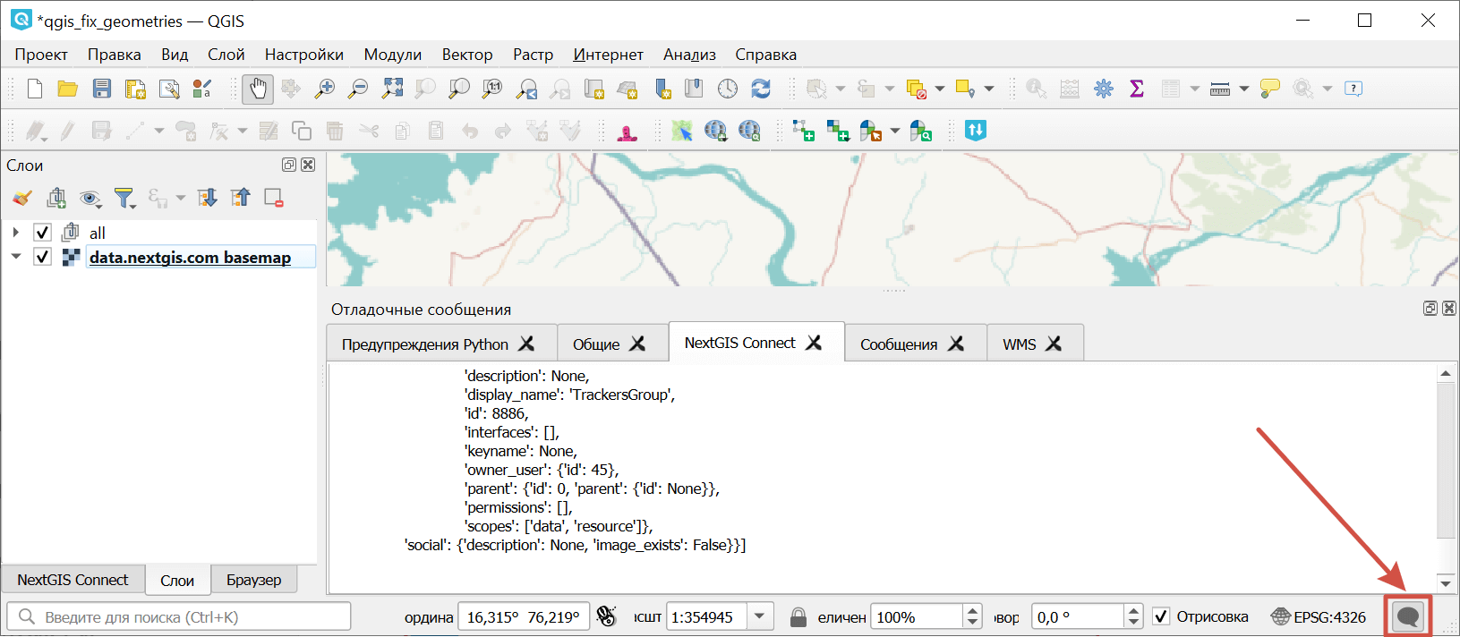 Чтобы открыть панель отладочных сообщений, нажмите на значок в правом нижнем углу окна NextGIS QGIS. Она состоит из нескольких вкладок, в которых сгруппированы сообщения о работе программы в целом и отдельных модулей.