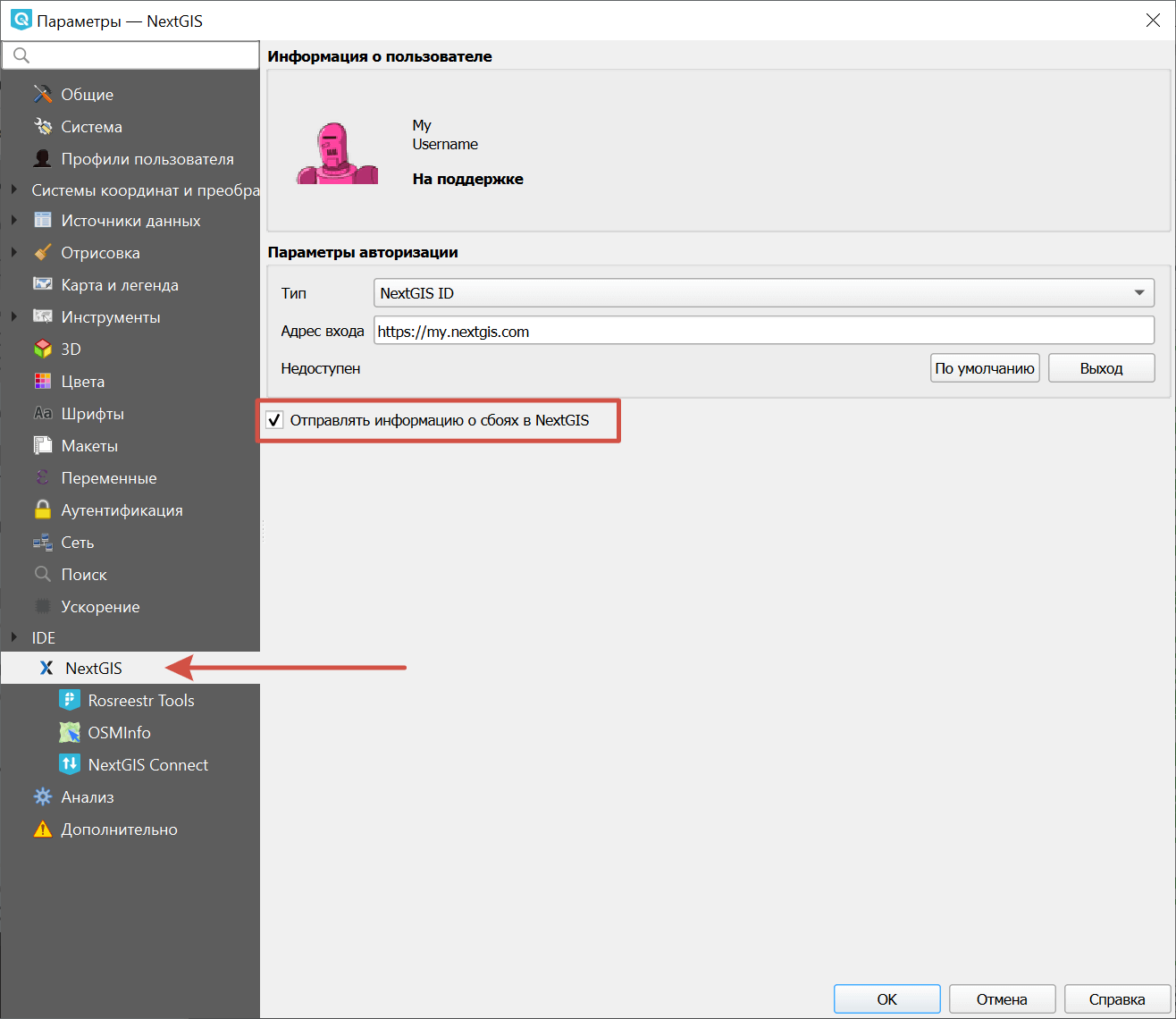 В верхнем меню выберите Настройки —> Параметры –> NextGIS ID и установите флажок «Отправлять информацию о сбоях в NextGIS».