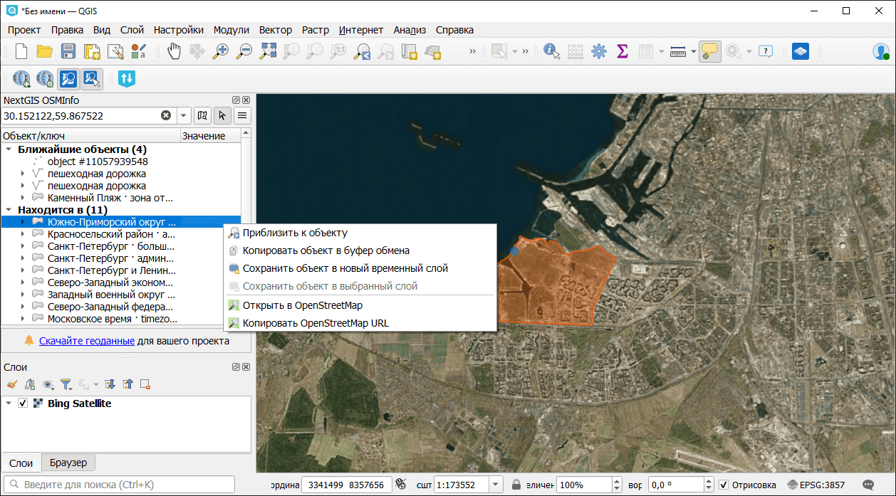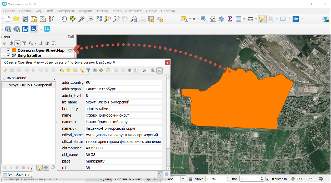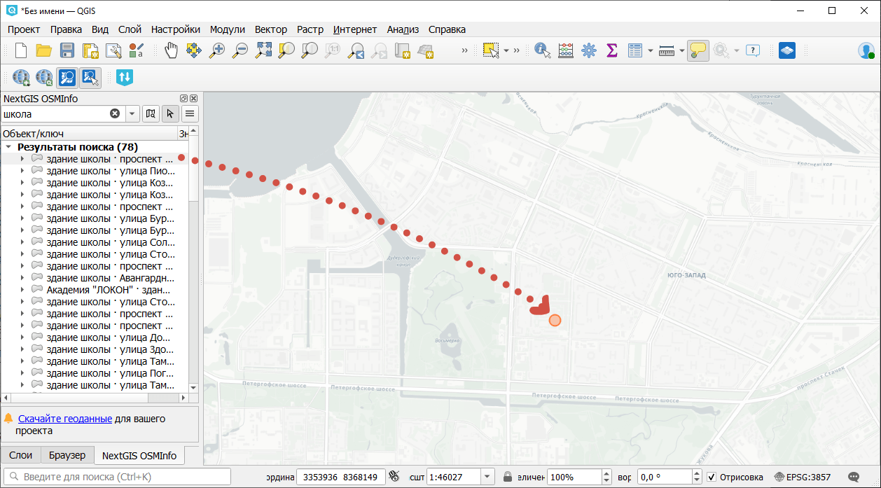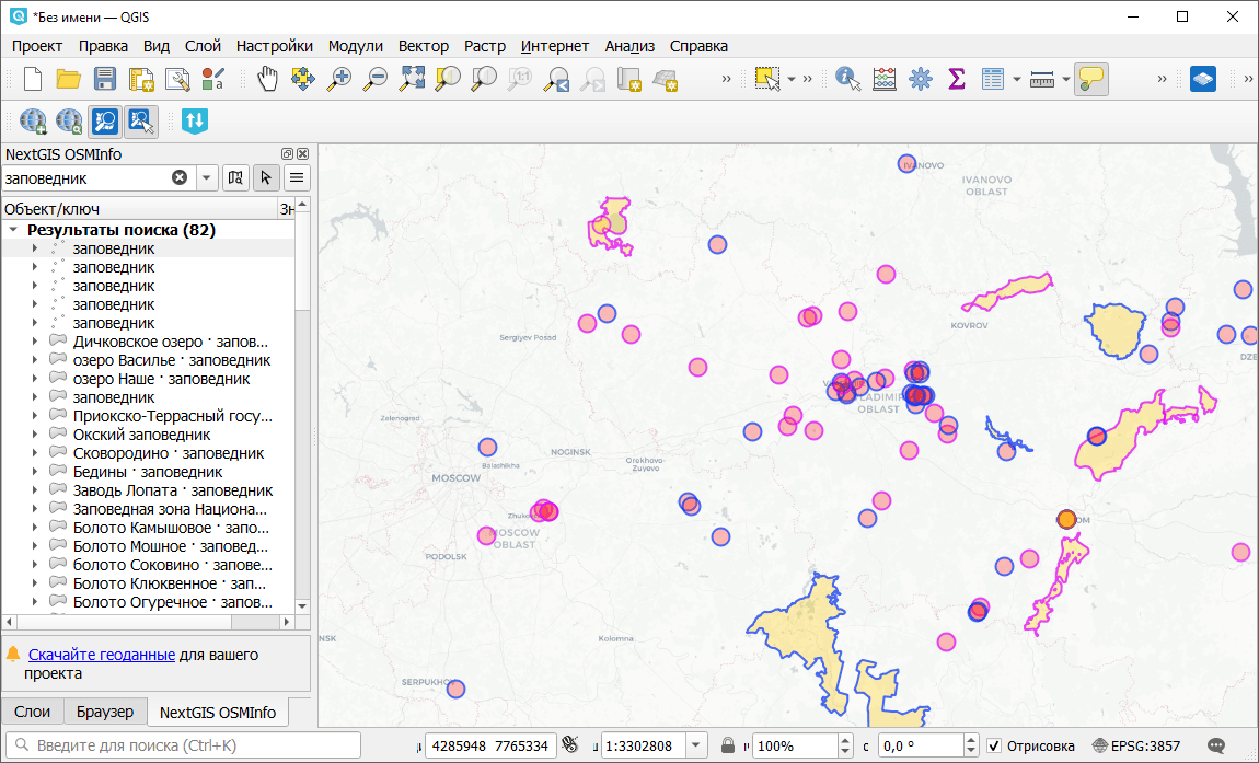 Модуль позволяет не только идентифицировать, но и искать объекты в базе OpenStreetMap. Для этого в панели модуля активируйте