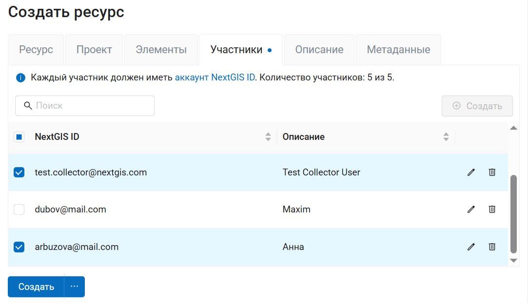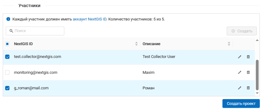 В разделе Панели управления «Проекты Collector» настраивается список участников, которые могут быть включены в проекты сбора данных. Каждый участник должен иметь аккаунт NextGIS ID.