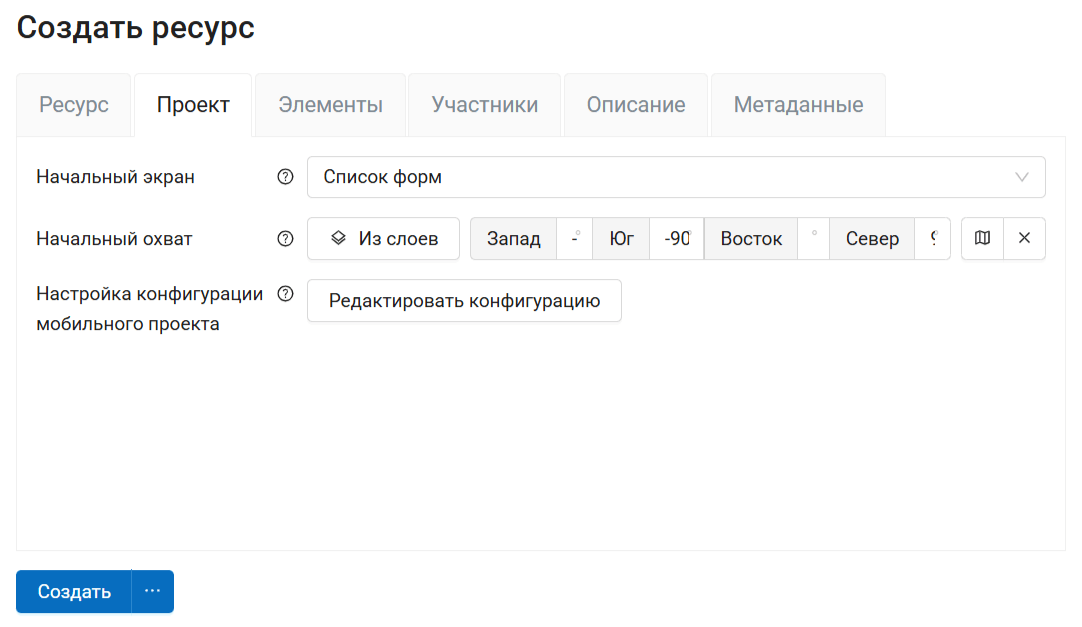 Зайдите в ресурс слоя, для которого хотите создать форму сбора данных. Нажмите кнопку Создать ресурс и выберите тип ресурса «Форма».