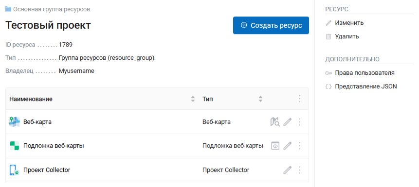 Если нажать на название папки наверху, вы перейдёте в группу ресурсов и увидите три созданных ресурса с наименованиями по умолчанию: проект Collector, веб-карту, на которую добавлены те же слои для визуализации собранных данных, и стандартную подложку.