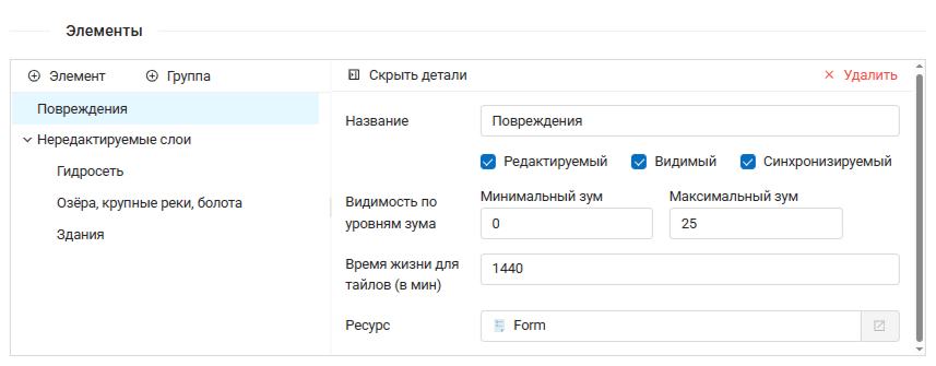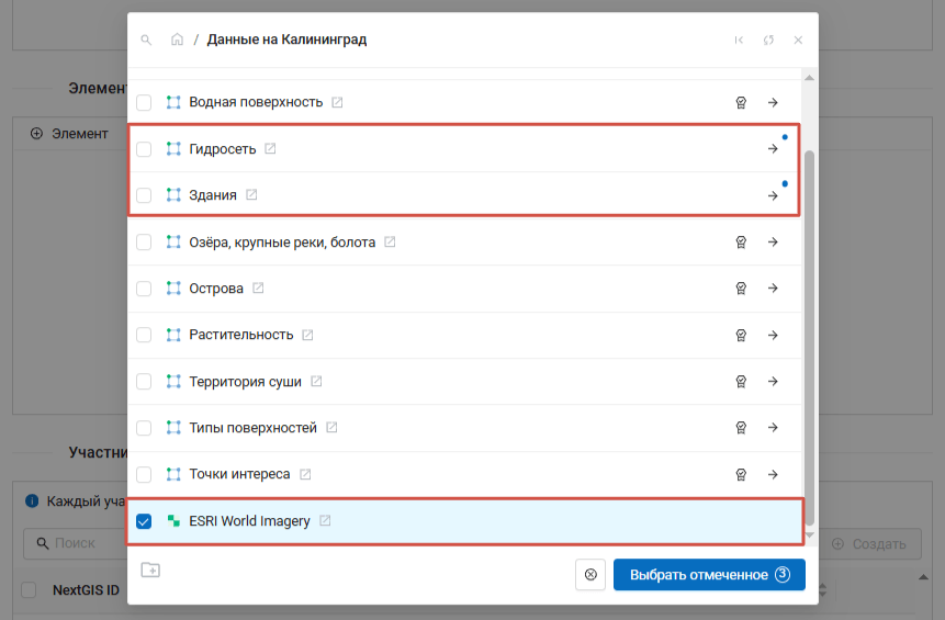 Чтобы добавить редактируемый слой данных выберите слой (или, если в слое две и более форм сбора данных, можно выбрать одну или несколько форм);