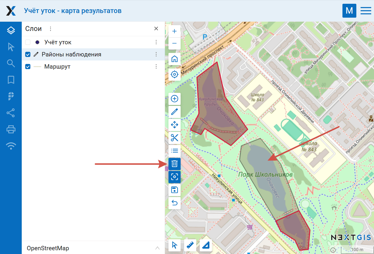 «Удалить объекты».Выберите на карте объекты, которые хотите удалить, щелкнув по ним курсором мыши. Цветной контур, показывающий доступность для редактирования, исчезнет.