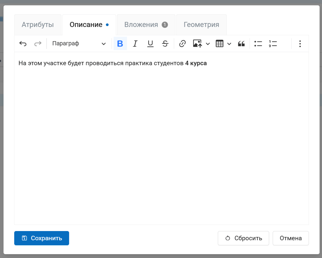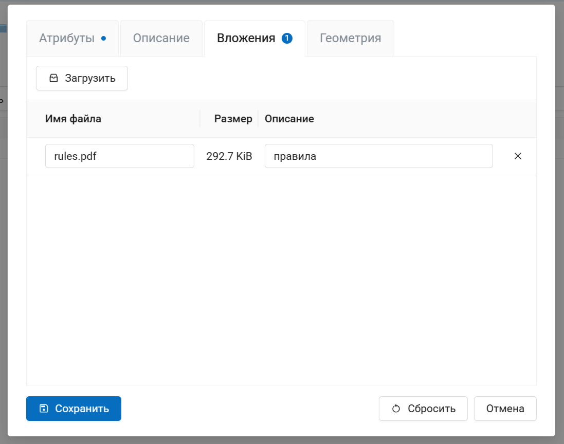 На вкладках «Описание» и «Вложения» к каждому объекту возможно прикрепить произвольное описание и неограниченное количество файлов, для каждого из которых также можно задать собственное описание.