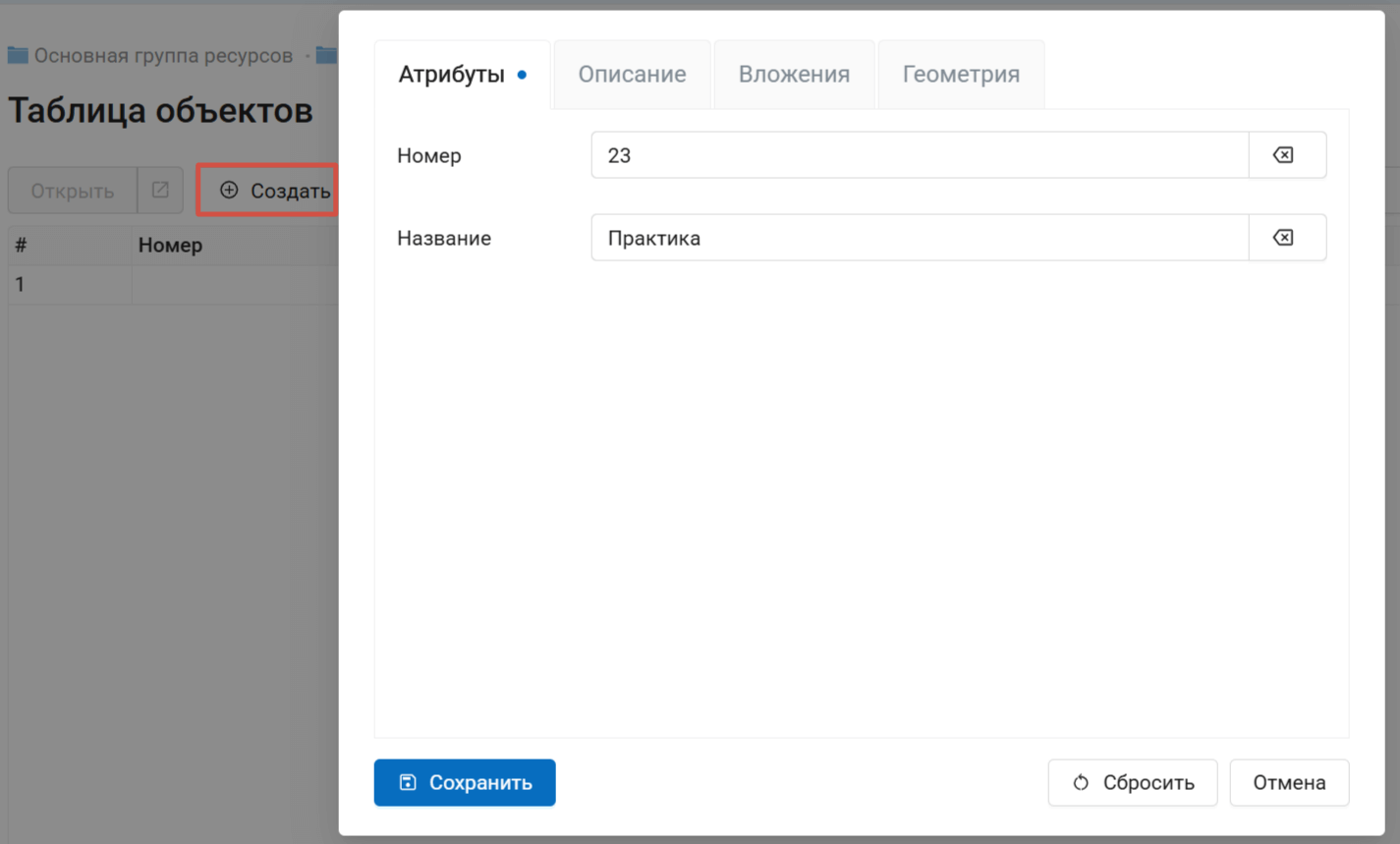 Для завершения создания объекта нажмите кнопку Сохранить. В таблицу объектов будет добавлена новая запись.