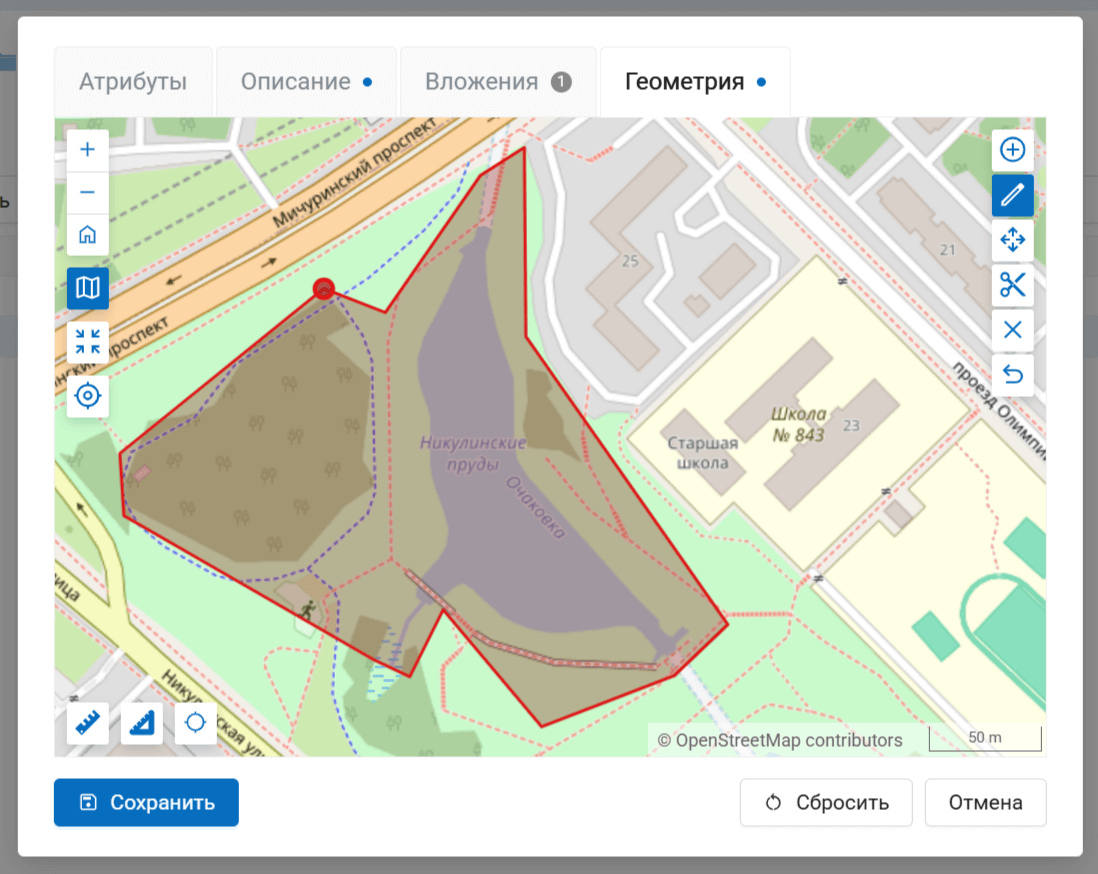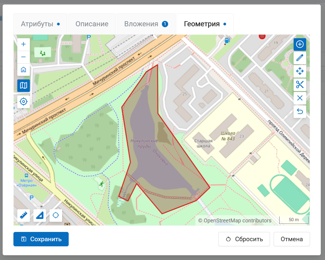 Редактировать. Во всплывающем окне вы можете изменять значения атрибутов, менять описание и геометрию и управлять вложениями.