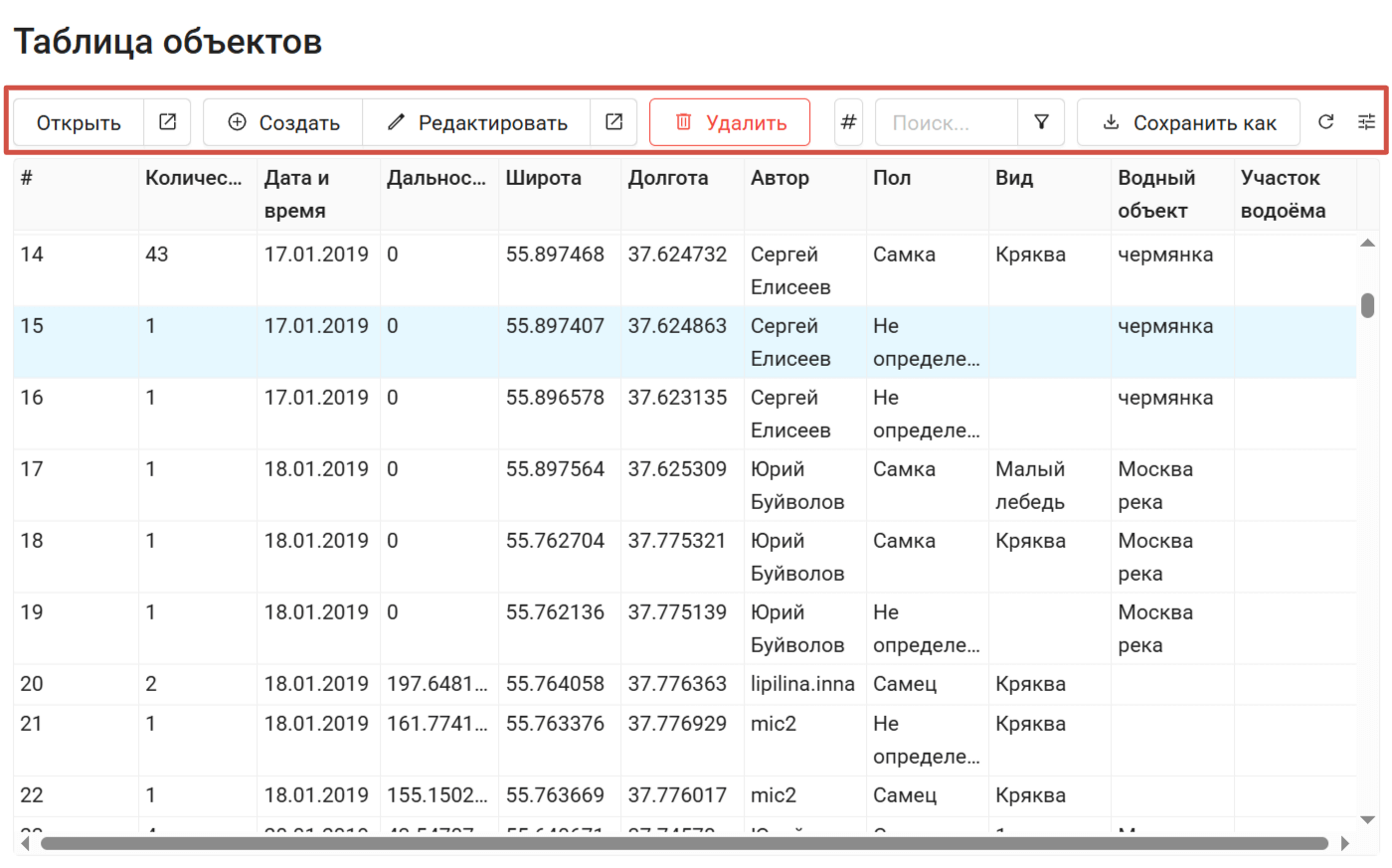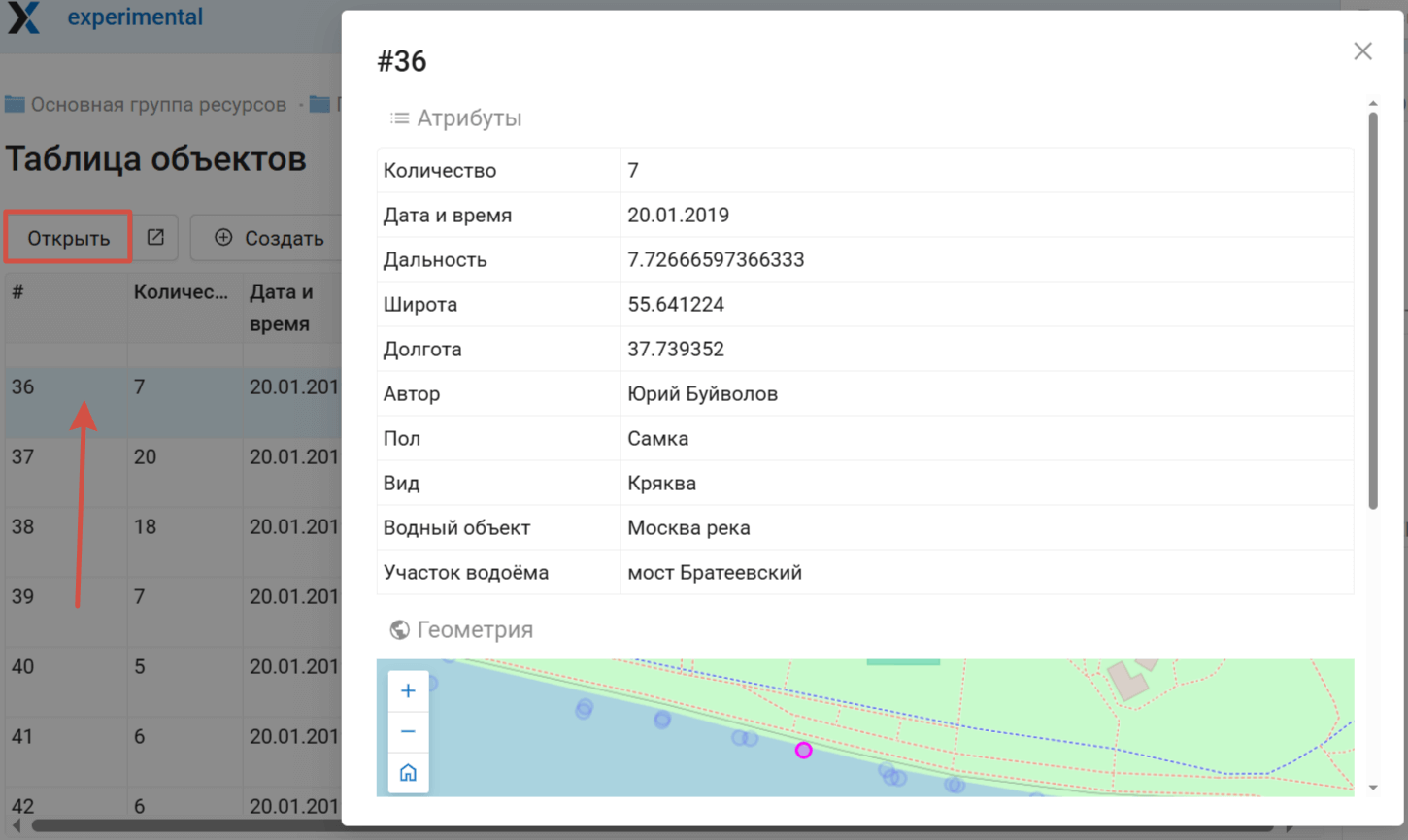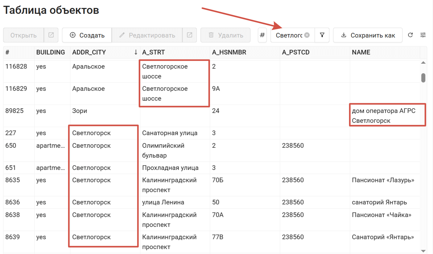 Таблицу объектов также можно открыть на веб-карте, тогда будут доступны также специфические операции, связанные с картой.