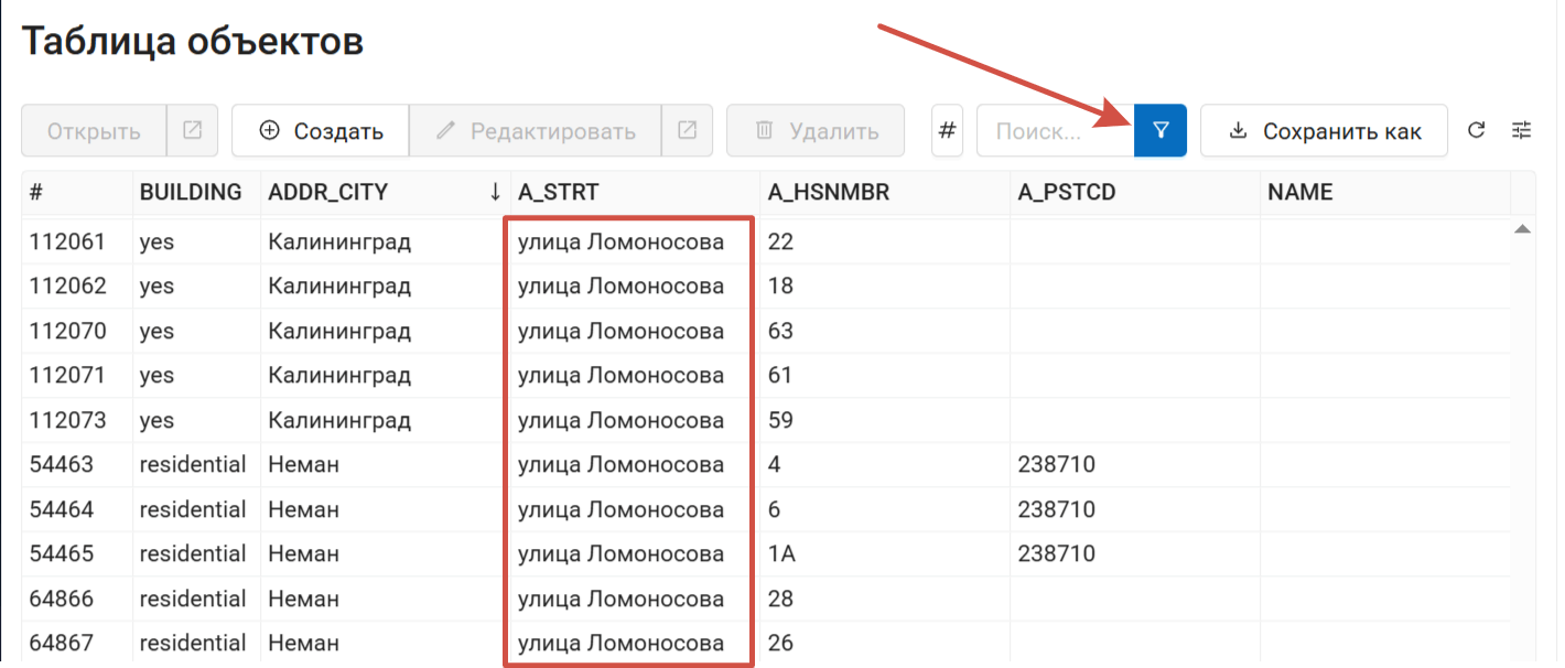 В правом верхнем углу доступно окно поиска. Введите в него текст. Объекты в таблице, значения атрибутов которых содержат этот текст, будут отфильтрованы без перезагрузки страницы.