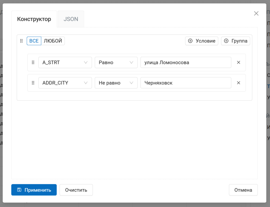 Например, улица Ломоносова есть в нескольких населенных пунктах Калининградской области, и нужно отобрать все, кроме города Черняховска. Для этого задаем два условия: A_STRT равно «улица Ломоносова» и ADDR_CITY не равно «Черняховск». В левом верхнем углу выбираем вариант «все» - оба условия должны быть соблюдены.