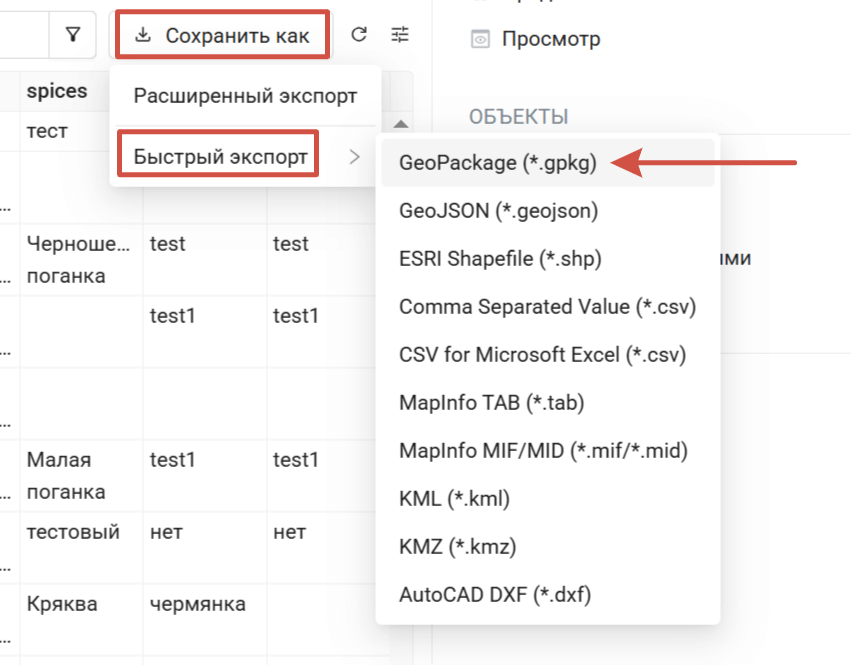 Чтобы быстро сохранить объекты таблицы в файл, нажмите Сохранить как, в выпадающем меню нажмите Быстрый экспорт и выберите формат, в который хотите экспортировать данные.