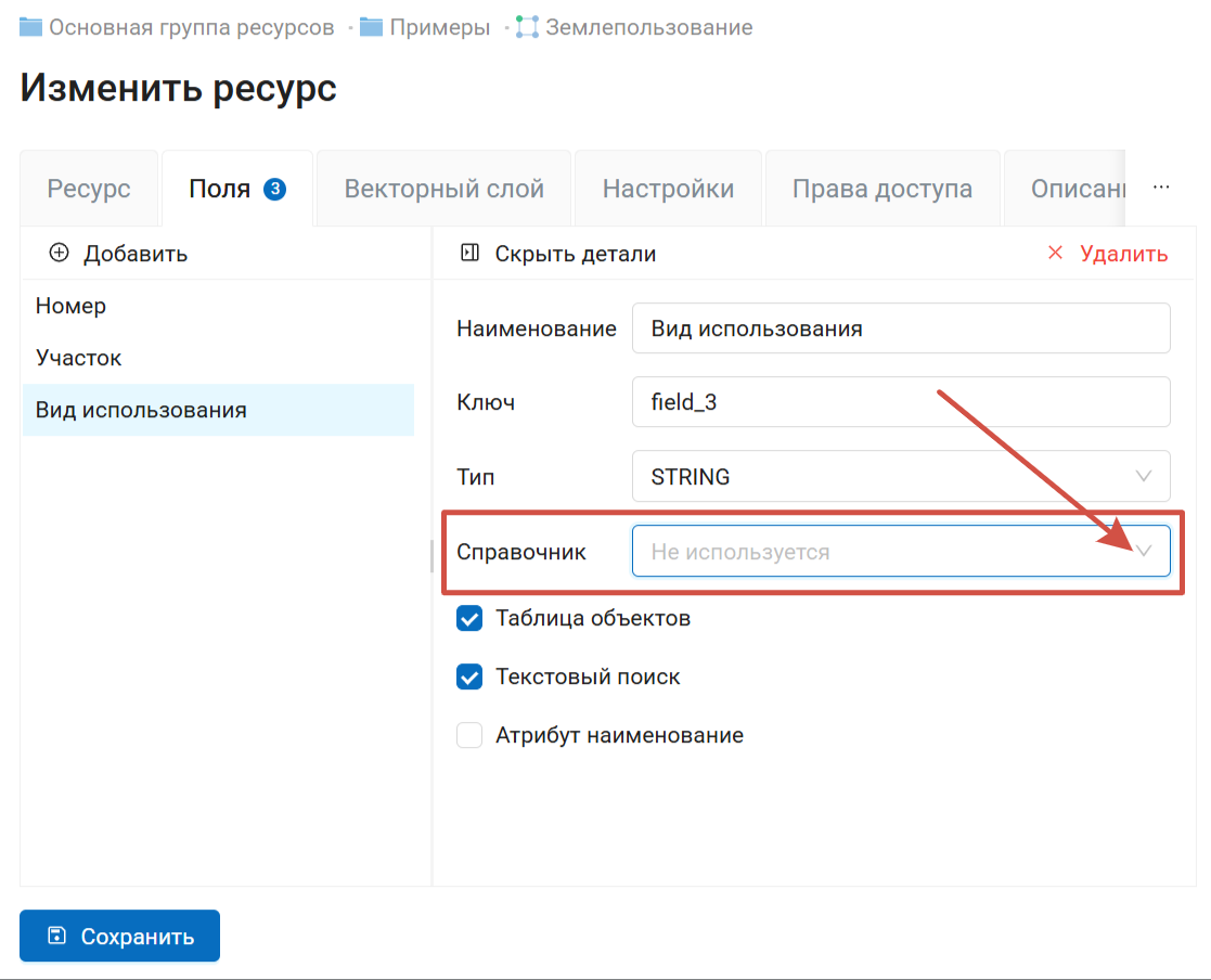 При редактировании атрибута также можно подключить справочник, из которого будут браться значения атрибута при добавлении или редактировании объектов.