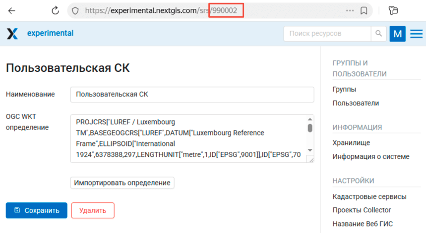 Для пользовательских систем координат, не имеющих кода EPSG и добавляемых через определение, создаётся индивидуальный цифровой идентификатор. Его можно увидеть в режиме редактирования этой СК в конце адресной строки: