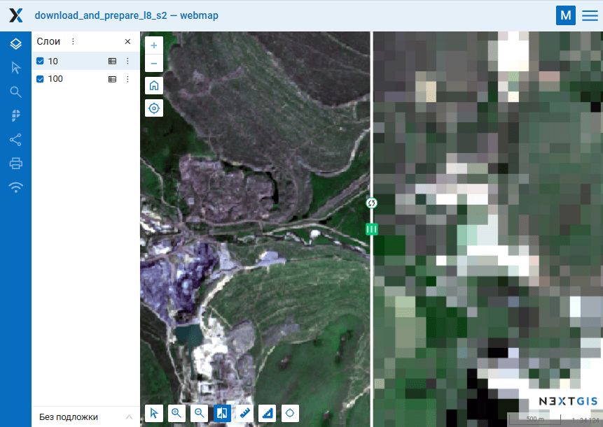 Рис. 3.85. Разные разрешения для одной территории: 10 м и 100 м. Для сравнения слоёв используется шторка¶