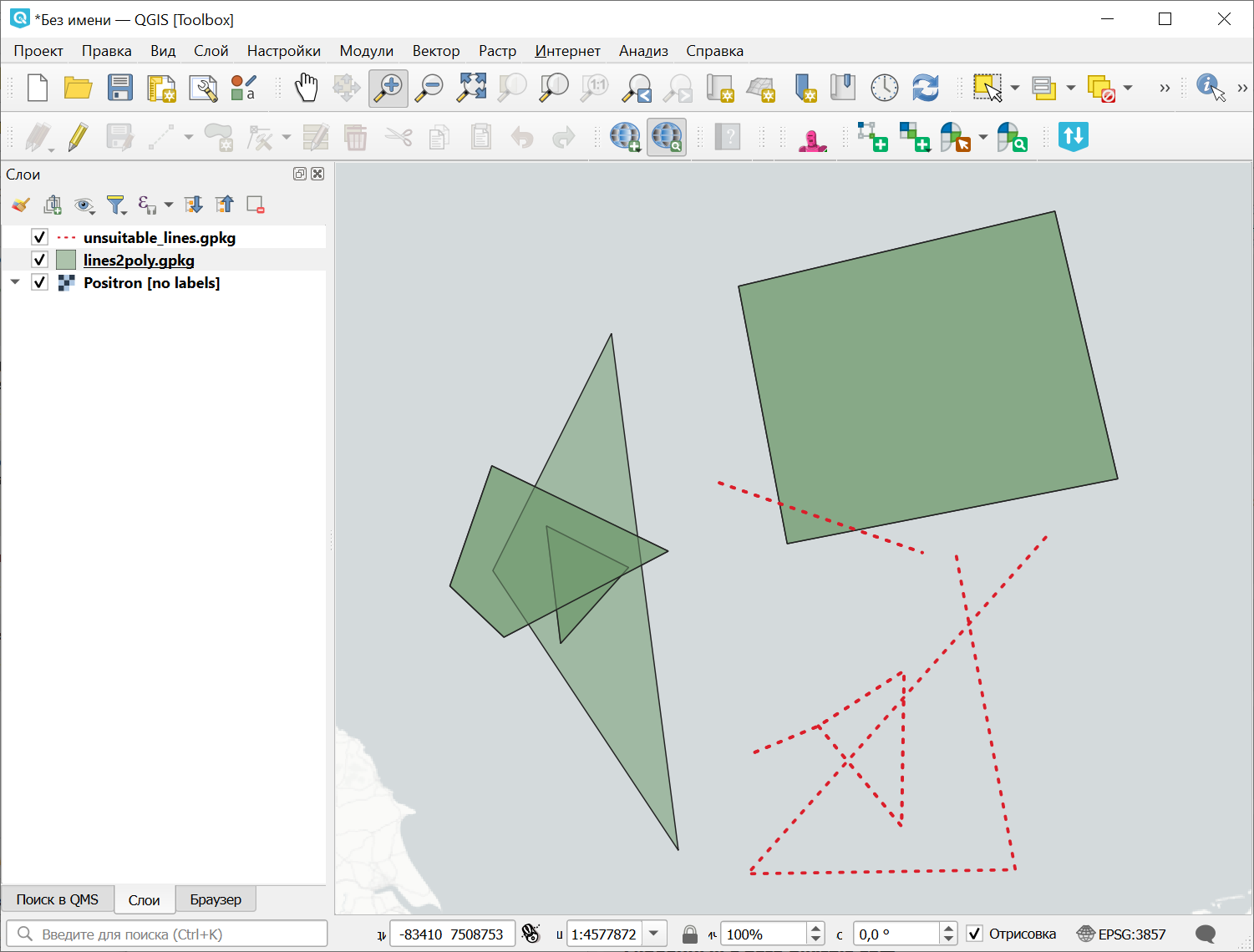Рис. 2.83. Полученные полигоны и линии, из которых не удалось создать полигоны¶