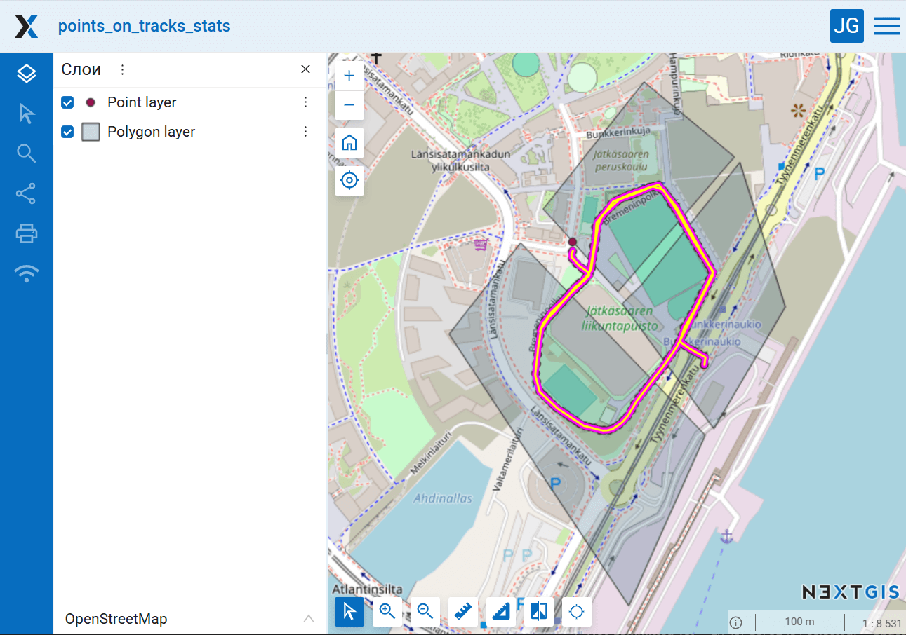 Подсчет количества точек на километр треков внутри полигонов, все данные берутся из NextGIS Web